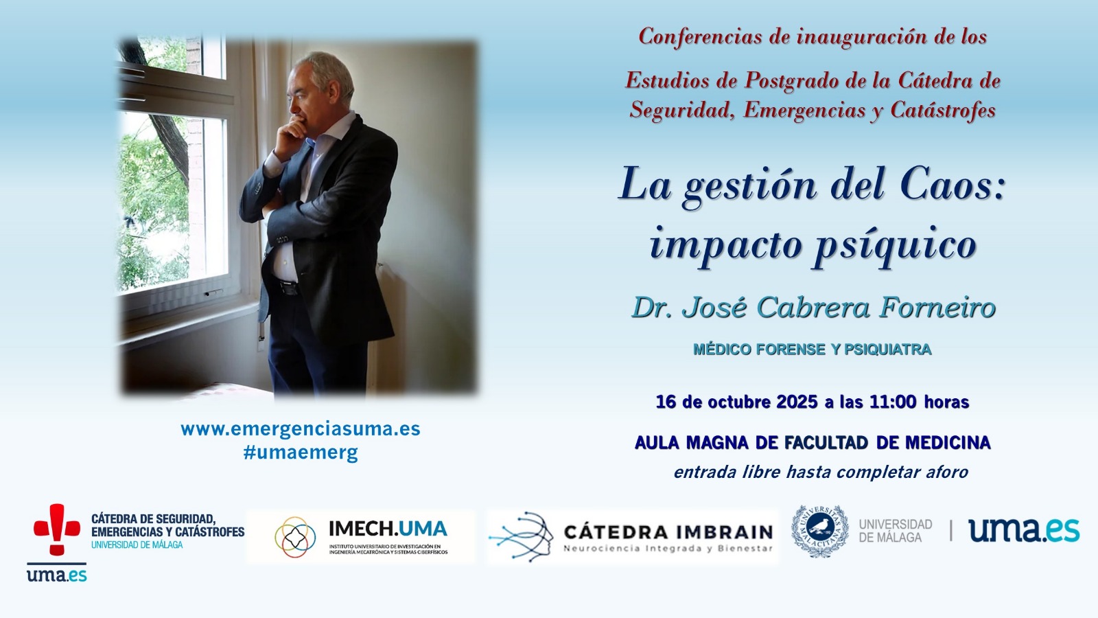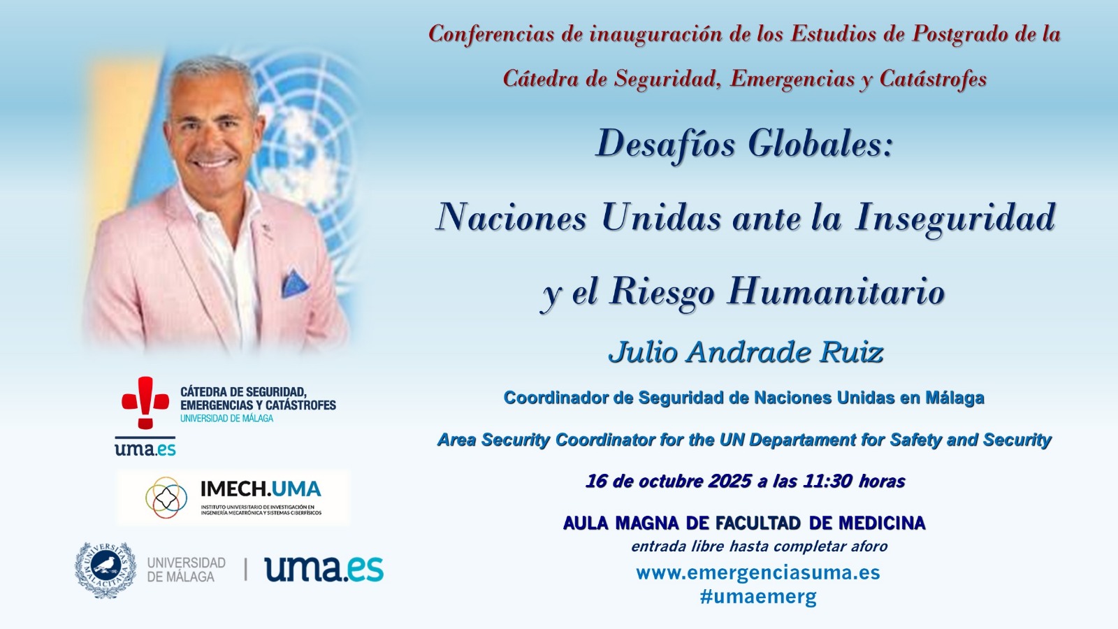 El próximo jueves 16 de octubre será el Acto Inaugural de los Estudios de Posgrados de la Cátedra de Seguridad, Emergencias y Catástrofes de la Universidad de Málaga.